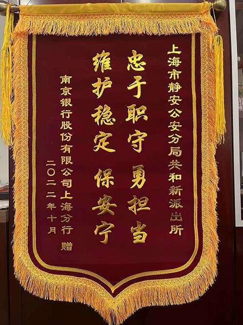 1月10日,南京銀行上海分行向奮戰在一線的上海市靜安公安分局共和新路派出所的民警們贈送錦旗,在中國人民警察節這一天致以最誠摯的祝福。