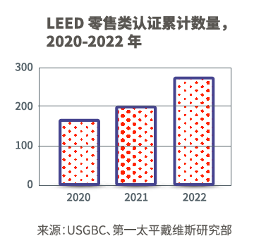 認證項目從單一門店擴至商業中心等大型綜合體,由新建建筑延伸至存量建筑,直接體現綠色建筑體量的擴大和人們對環保的共識。獲得認證的空間還可以與租戶良性互動,產生更大的積極效應。