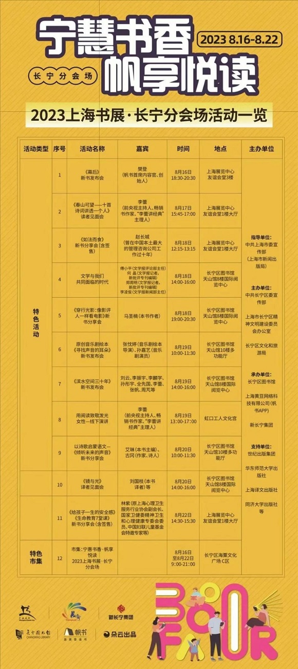 今年的書展長寧分會場就設在帆書所在的海粟文化廣場,內容精彩紛呈,可謂是“一區一特色”,分會場推出了兩大特色活動。其一在海粟文化廣場開啟戶外圖書市集,世紀出版、長寧圖書館、樊登書店等為市民帶來新書首發和暢銷書籍售賣等,二便是我們最期待的閱讀分享活動,帆書與長寧區圖書館合作,7天7場閱讀分享、新書推薦、名家見面會、簽售等活動,針對不同文化需求讀者群,開展多元化文化活動。同時,位于海粟文化廣場一樓嶄新開業的帆書·樊登書店上海首店也將依托豐富的知識產品,成為打破界限的創意文化社交空間,為市民打造“精品沙龍+大咖講書+生活美學課堂+文化娛樂空間”為一體的書香生活體驗。