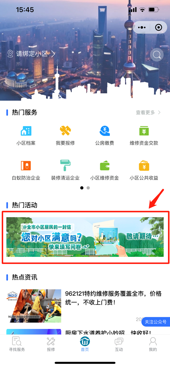 上海物業小程序,進入小程序點擊下圖紅框區域即可填寫問卷,還可參與在線抽獎。