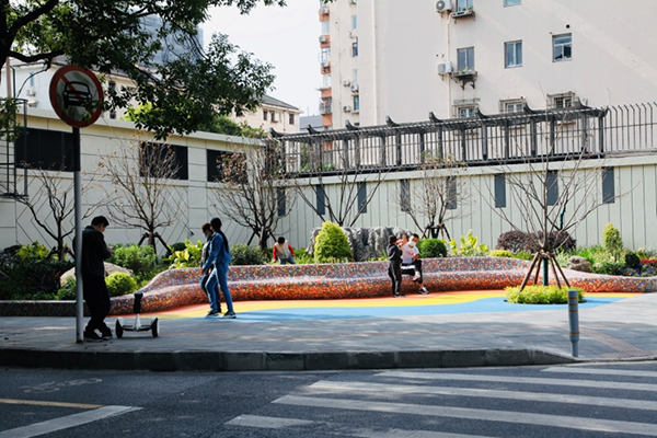 七彩的小瓷磚像游龍、如彩虹,從鞍山支路一彎一折迤邐到彰武路,“楊浦公眾號把它稱作‘彩虹公園’,說:街角出現一條彩虹。就這樣傳開了?!崩盍终f,照片發在網上,贊者不斷,我們當然高興。