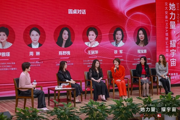 圓桌論壇環節,麗業集團創始人、交大安泰EMBA領琇匯會長王麗萍、上海市三八紅旗手程寶惠、交大安泰EMBA領琇匯副會長尹雅瑾、上海市閔行高端人才服務中心主任周琳、GRACE CHEN高級時裝品牌創始人陳野槐、上海萊佛士醫院副院長徐軍等六位女嘉賓圍繞如何在新征程上,積極投身新時代的偉大實踐,拼搏進取,擔當奉獻,展現“半邊天”的風采展開深入探討。