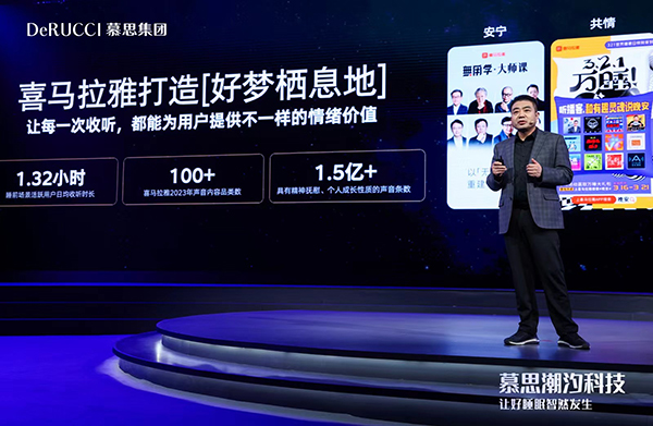 3月20日,慕思首席體驗官、喜馬拉雅高級副總裁傅海波在慕思潮汐科技新品發布會上發表了“聽,讓好睡眠智然發生”的演講。他強調,聽音頻已成為人們在睡前獲取情緒能量的潮流方式。會上,喜馬拉雅宣布與慕思達成戰略合作,雙方將共同發揮在睡眠場景中的優勢,通過內容傳情和共建空間傳情,攜手打造情緒助眠新生態,共創[好夢棲息地]。