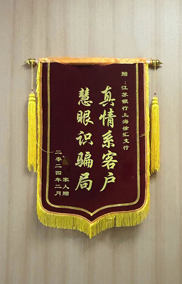 “真是多虧了你們江蘇銀行的工作人員,如果不是你們的幫助,我的40萬元血汗錢不知道轉到哪去了”,近日,一位老年客戶將印有“慧眼識騙局,真情系客戶”的錦旗送到了江蘇銀行上海徐匯支行。
