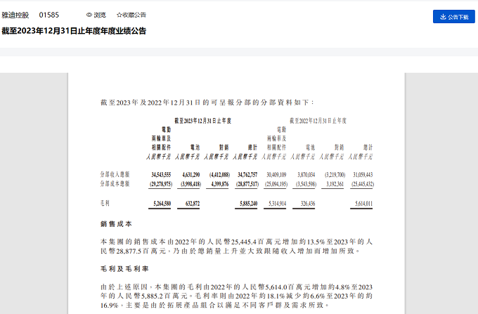 雅迪控股財報指出,2023年,集團的銷售成本288.78億元,同比增加13.5%。以至于公司毛利率驟減,公司毛利58.85億元,同比增加4.8%;毛利率則由2022年18.1%減少6.6%至2023年的16.9%。對此,雅迪控股表示,主要是由于拓展產品組合以滿足不同客戶群及需求所致。
