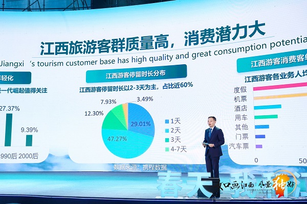 推介會上,攜程集團副總裁、政府合作部總經理張旭,做了《江西文旅市場洞察及線路推介》主旨演講。根據攜程數據,2023年江西度假業務的人次和消費金額,均分別恢復至2019年的121%、124%,恢復速度超全國水平。2024年一季度,江西旅游總體人次同比增長31.58%,總體消費同比增長32.38%,增長勢頭十分強勁。