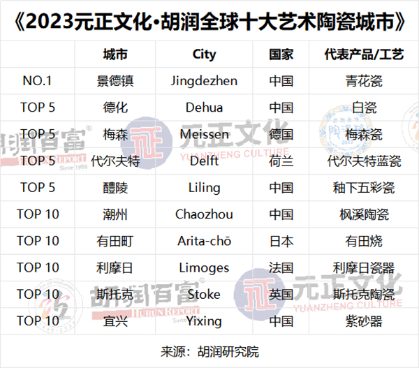 4月17日,胡潤研究院攜手元正文化在上海發布《2023元正文化·胡潤全球十大藝術陶瓷城市》,列出了全球最具典范價值的十大藝術陶瓷城市。同時發布《2023元正文化·胡潤中國日用陶瓷企業榜》。這是胡潤研究院首次發布陶瓷領域相關榜單。