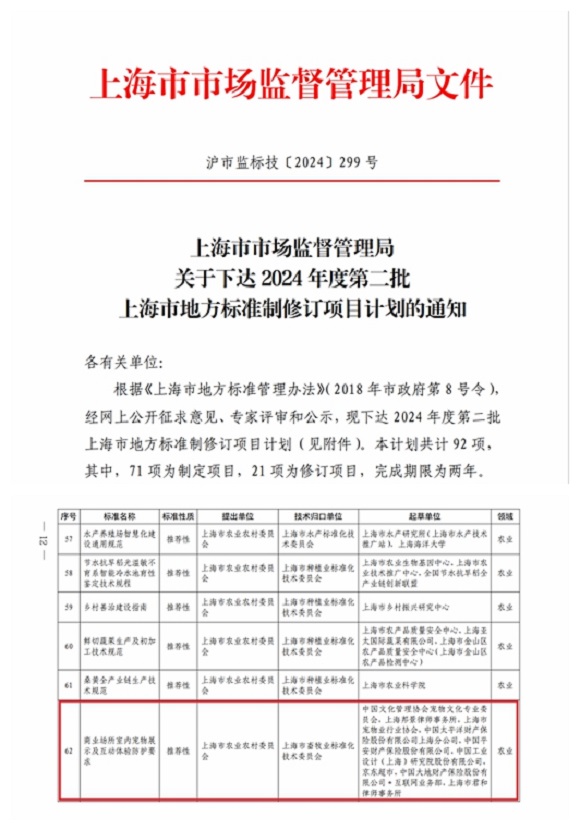近日,上海市市場監督管理局發布《關于下達2024年度第二批上海市地方標準制修訂項目計劃的通知》,其中《商業場所室內寵物展示及互動體驗防護要求》獲準制定立項(制定第62項);這將是首個適用于商業室內場所寵物服務的地方標準。