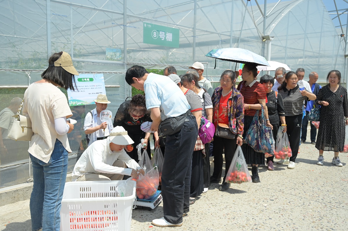 村里工作人員在給會員采摘的番茄稱重    丁新 攝